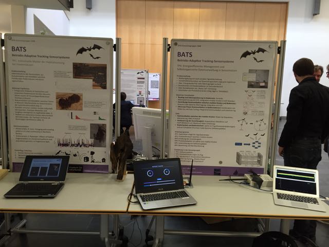 Besides every project having its own small indoor demo, we had an outdoor demo that basically combined the work of the different subprojects. We showed 1.8 gram sensor motes that were already put on bats in field tests in Panama. The signal from the mote were used for both data communication and ranging. The motes can communicate with each other and record the IDs of motes in close proximity (i.e. the bats friends). This meeting data is encoded using erasure codes and send to the ground network once the bat is in range.
