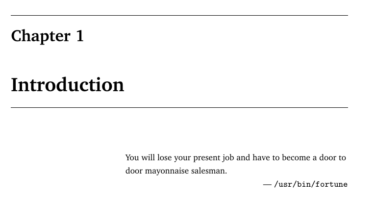 I’m not that kind of guy, but I also didn’t want to miss the unique opportunity to impress people by showing how intellectual I am. So I decided for using good old fortune to insert something for me. Currently, my chapter headers look something like: