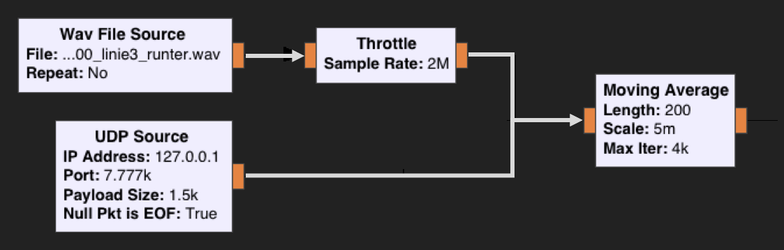 For offline signal analysis, the top branch is active, while the bottom branch is used for the live receiver. In the latter case, the signal conversion might be a bit tricky, as the fixed point samples from GQRX have to be converted to 32-bit floats and resampled, which can be done with a command like this.
