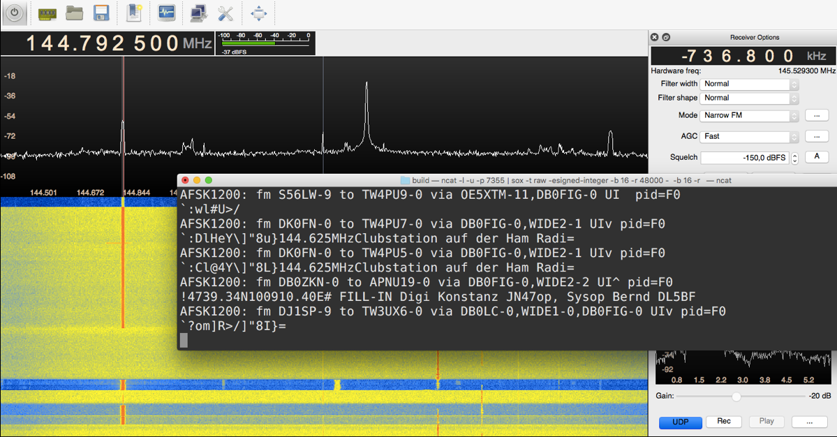 The idea was to show how GQRX can be combined with other software to (re)use it’s nice GUI. With some plumbing, that’s easily possible. In the talk, I showed how this can be done for Multimon, Inspectrum, and custom GNU Radio receivers. I didn’t talk about Audacity and Baudline, since, I think, they are made obsolete by Inspectrum; but more later.