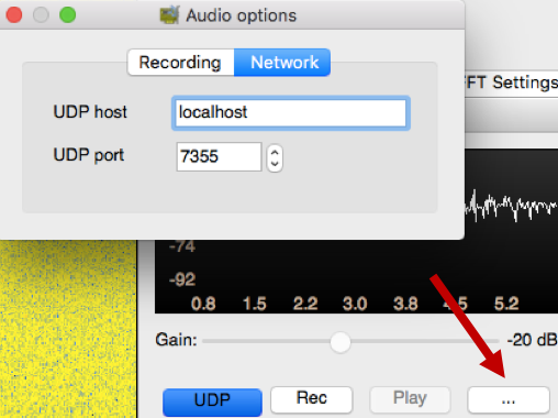 To record WAV files, one has to press the Rec button, while UDP starts streaming the audio signal through a network socket. The IP address and the port can be configured as shown in the picture.
