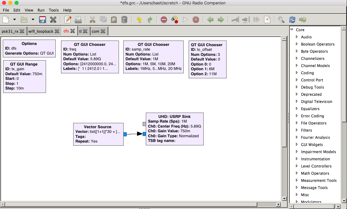 Of course, I wanted to emulate a radar and see whether the APs move away. “Implementing” these radar patterns in GNU Radio is as simple as it can be. A flow graph like this is already enough.