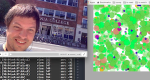 I am interested in alternative approaches to make the spectrum visible and audible. With SpectroPhone, I captured all WiFi signals and painted them as circles on a canvas. The color indicates the manufacturer of the chip that sent the frame, the size indicates the data that it carries, and the fade duration indicates the signal strength. To make it audible, I mapped the manufacturer to notes on the c major scale and let the signals play the notes.