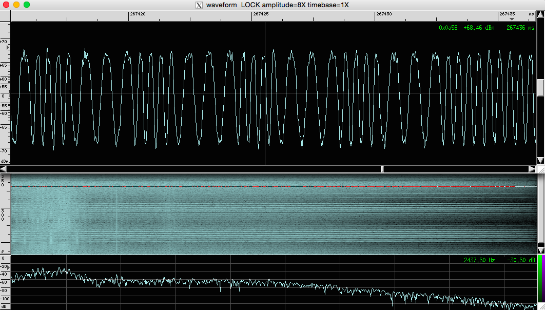As usual on that band, FM modulation with a bandwidth of around 18kHz was used. Using Baudline and Audacity, I studied the demodulated signal.