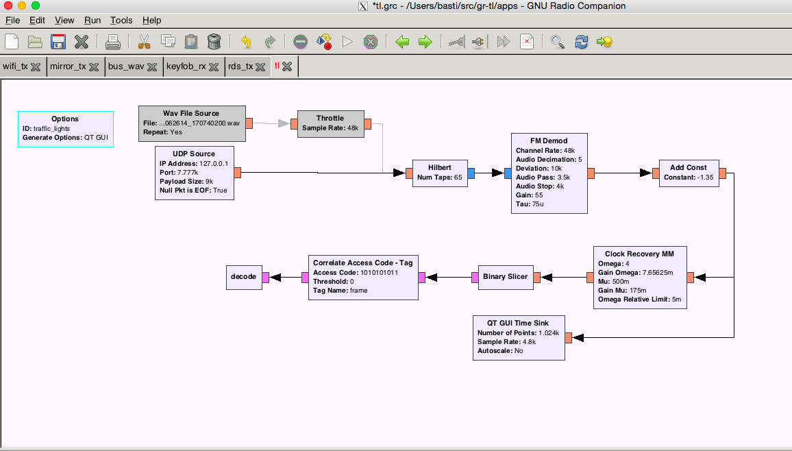 Of course, I wanted to have a look at the signal. I once heard that they transmit in the 2 meters band and that turned out to be true. With GQRX I found them at around 170MHz. The screenshot shows the two channels corresponding to the two pairs of traffic lights that operate independently.