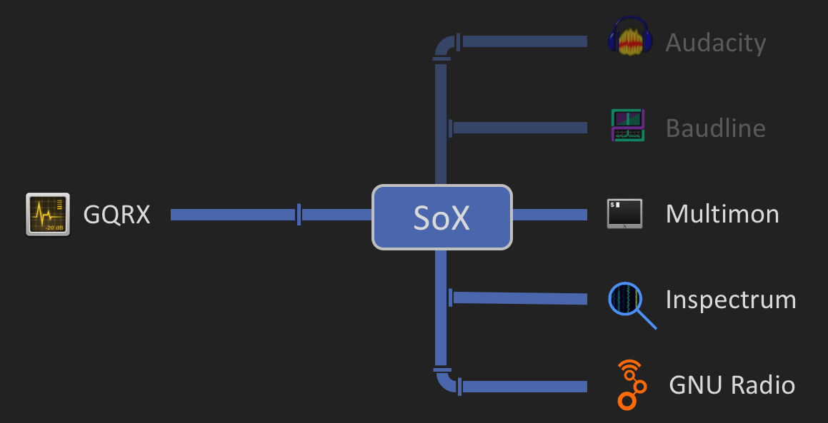 For offline signal analysis, the top branch is active, while the bottom branch is used for the live receiver. In the latter case, the signal conversion might be a bit tricky, as the fixed point samples from GQRX have to be converted to 32-bit floats and resampled, which can be done with a command like this.