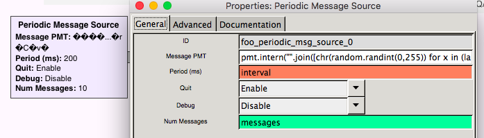 The first thing was to generate WiFi frames with a random payload. The WiFi transmitter expects PMTs (i.e., GNU Radio’s Polymorphic Message Type) as input, which can be produced with the Message Source block.
