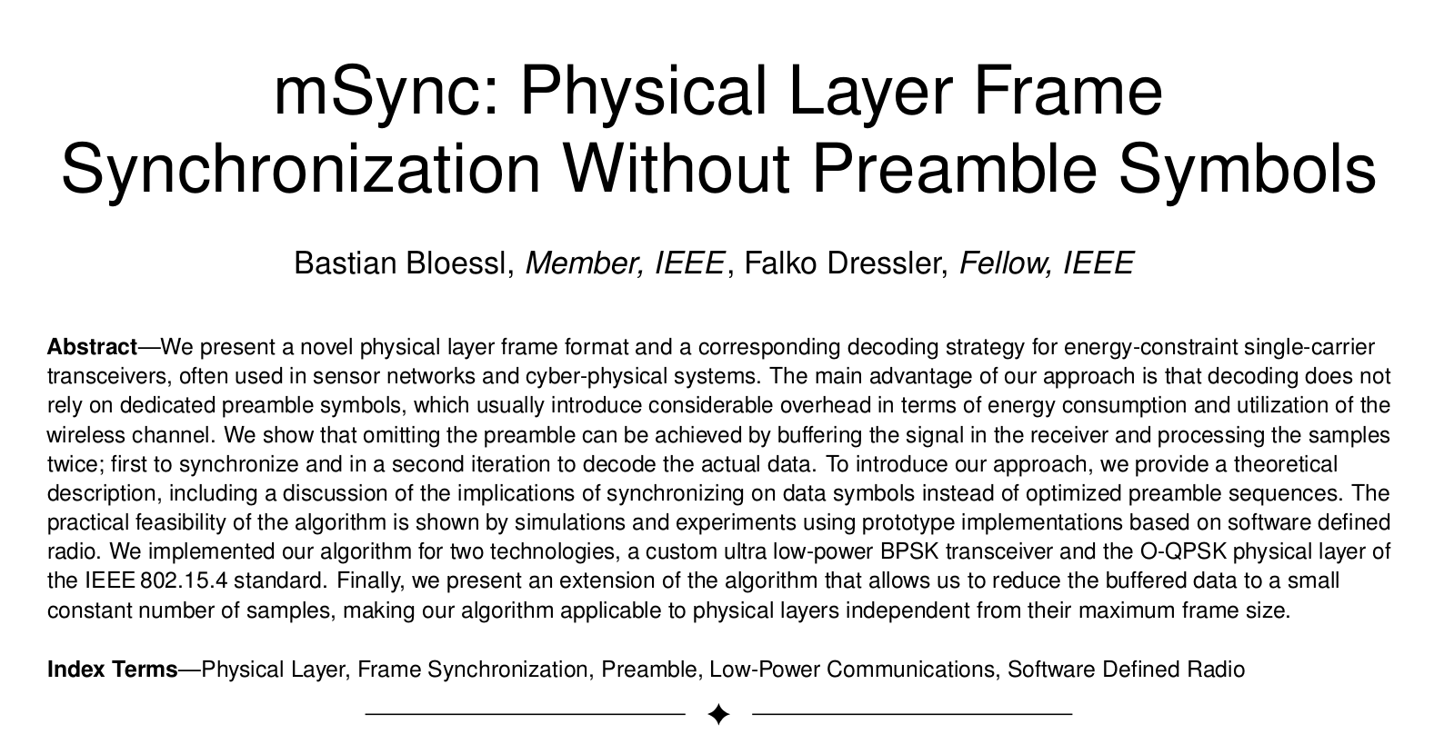 Bastian Bloessl and Falko Dressler, “mSync: Physical Layer Frame Synchronization Without Preamble Symbols,” IEEE Transactions on Mobile Computing, vol. 17 (10), pp. 2321-2333, October 2018.